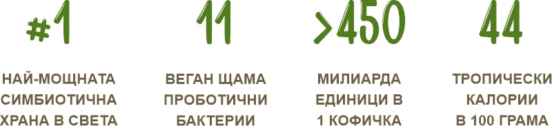 Днес използваме 11 веган щама полезни бактерии в тайно съотношение и патентован процес, чрез който постигаме развитие от 450 милиарда до 1.35 трилиона пробиотични единици в една кофичка.